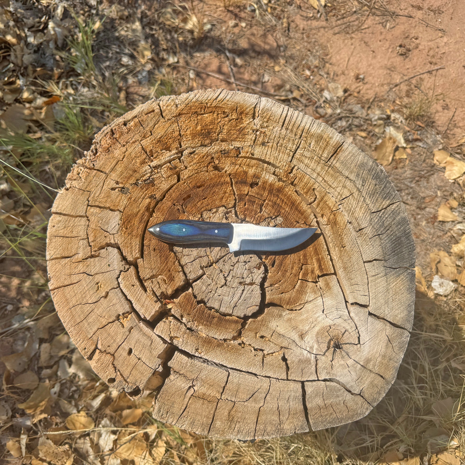 The Blue Ridge Hunter Knife from Blue Spade Forge is a dependable companion for the outdoorsman who values craftsmanship and performance. Featuring a sweeping, upswept blade, this knife is ideal for skinning and slicing tasks, offering excellent edge retention and cutting control. The full-tang design is paired with a richly grained wood handle in a deep blue hue, contoured for a secure and comfortable grip. Reinforced with triple rivets and shaped for precision handling, it’s as durable as it is eye-catching. Complete with a hand-stitched leather sheath, this knife is ready for any adventure in the field or forest.