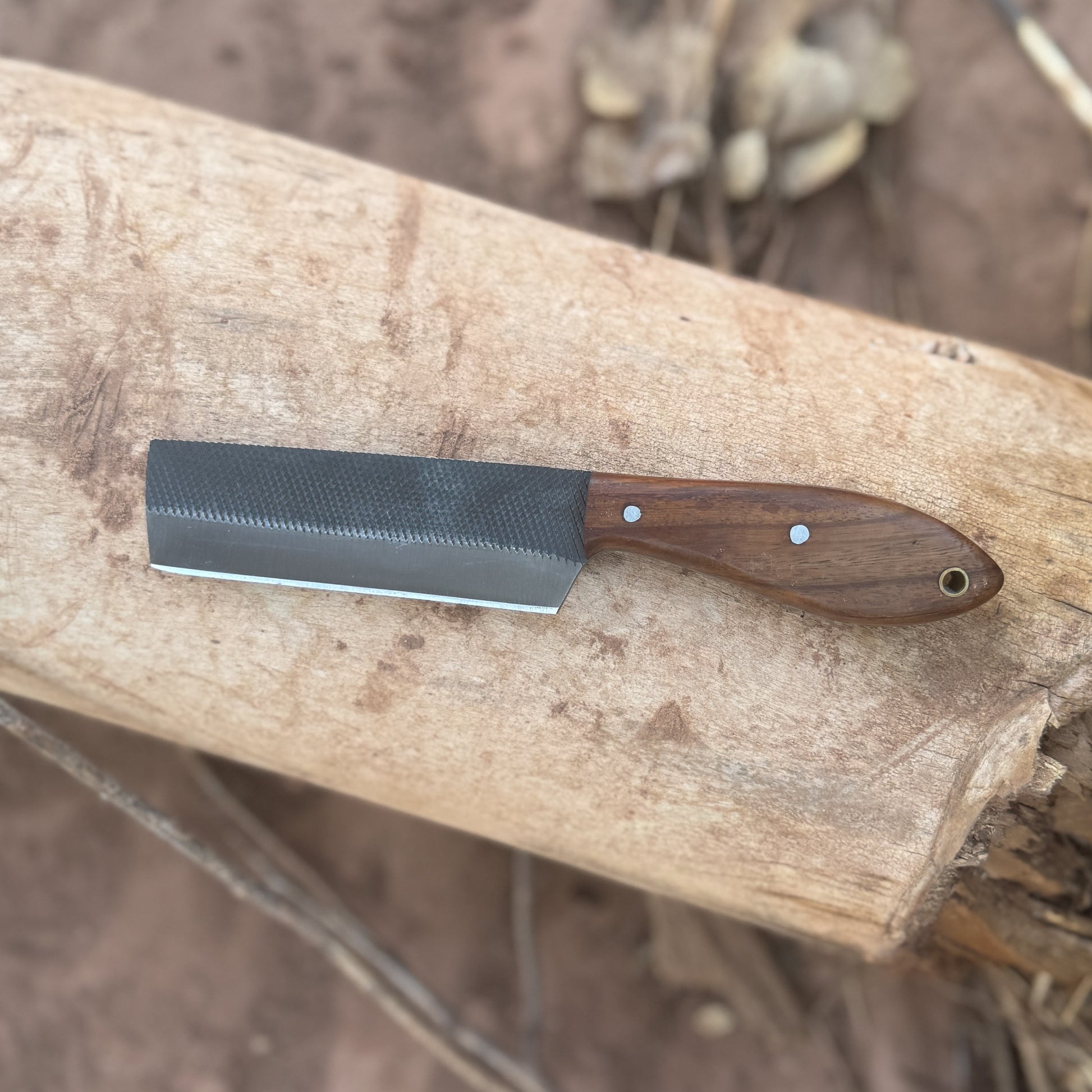 A rugged cowboy rasp knife forged from reclaimed steel with a wide chopping edge, walnut handle, and hand-tooled leather sheath.