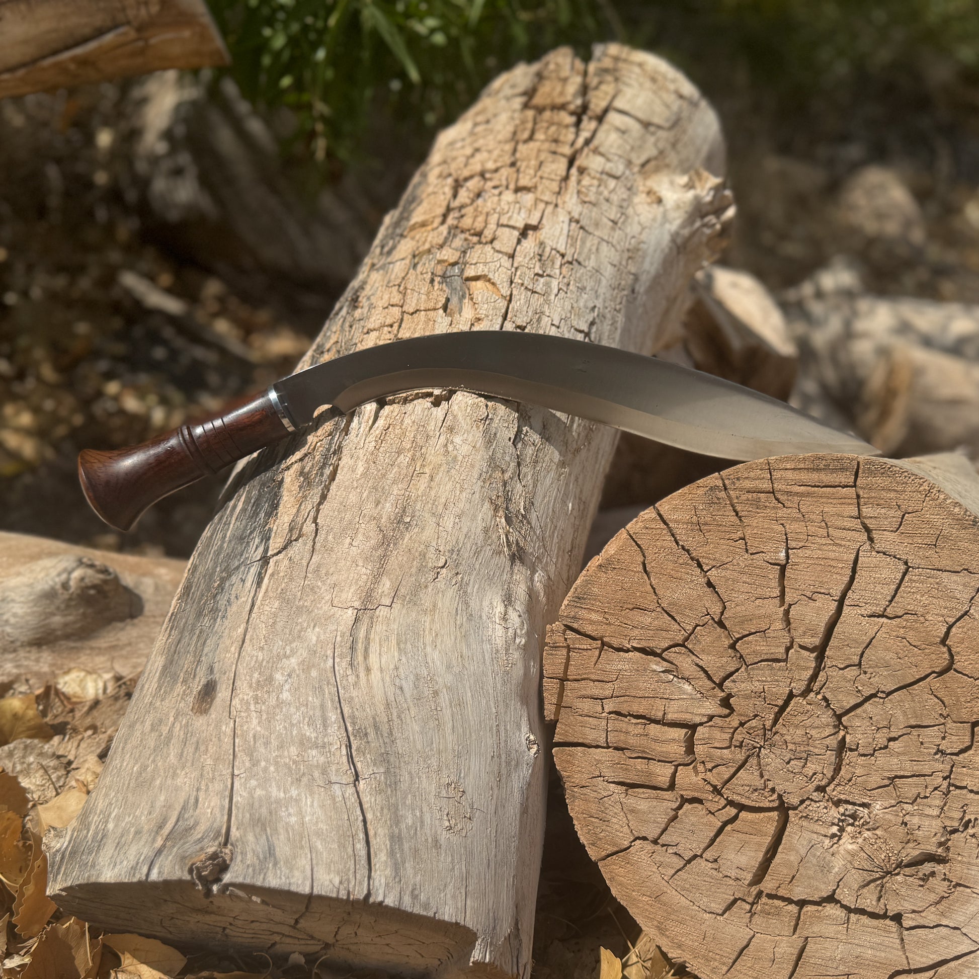 A traditional high-carbon kukri with a hardwood handle and stitched leather sheath, powerful, balanced, and built for the outdoors.