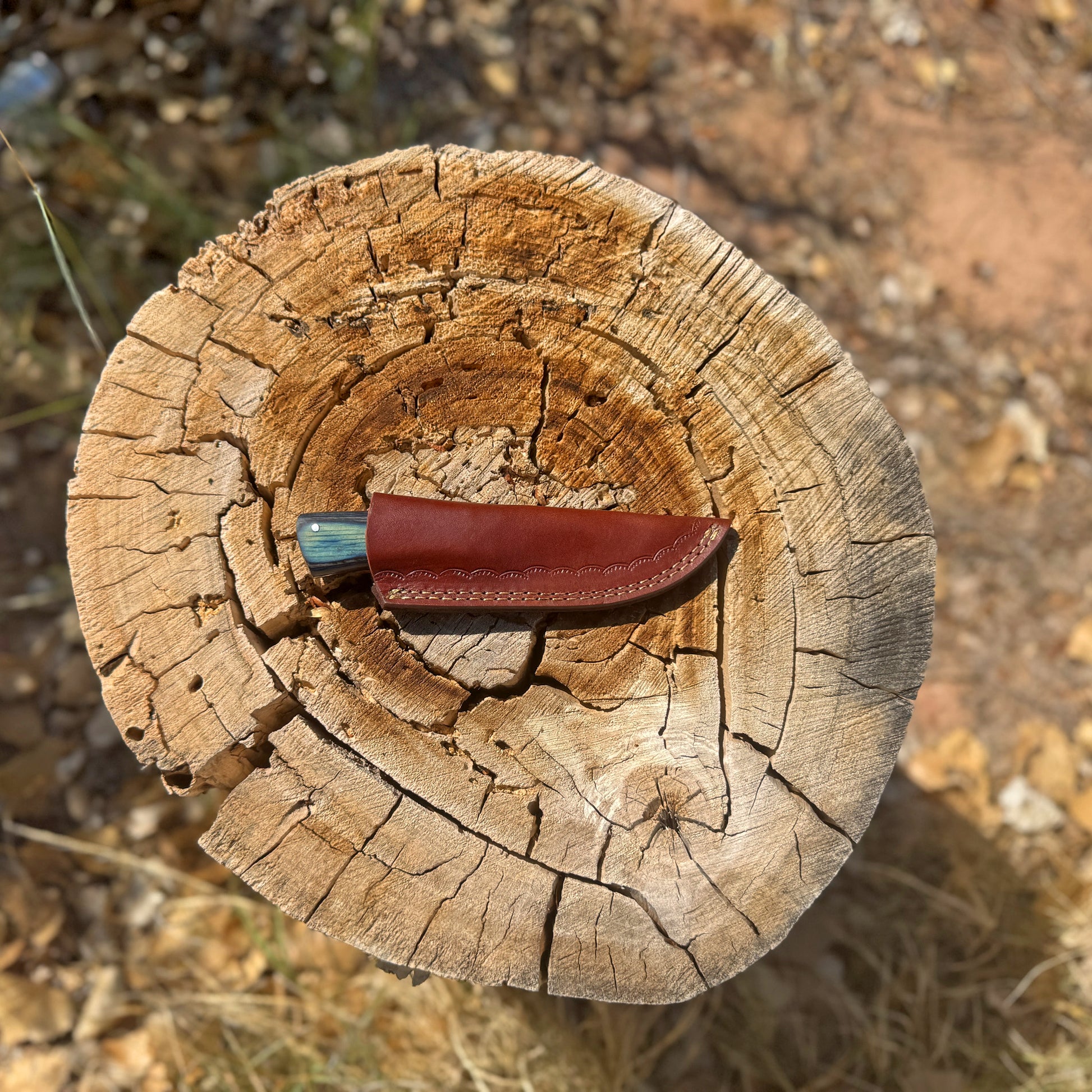 Ironwood Ridge Fixed Blade Knife – Blue-Streaked Wood Handle with Leather Sheath