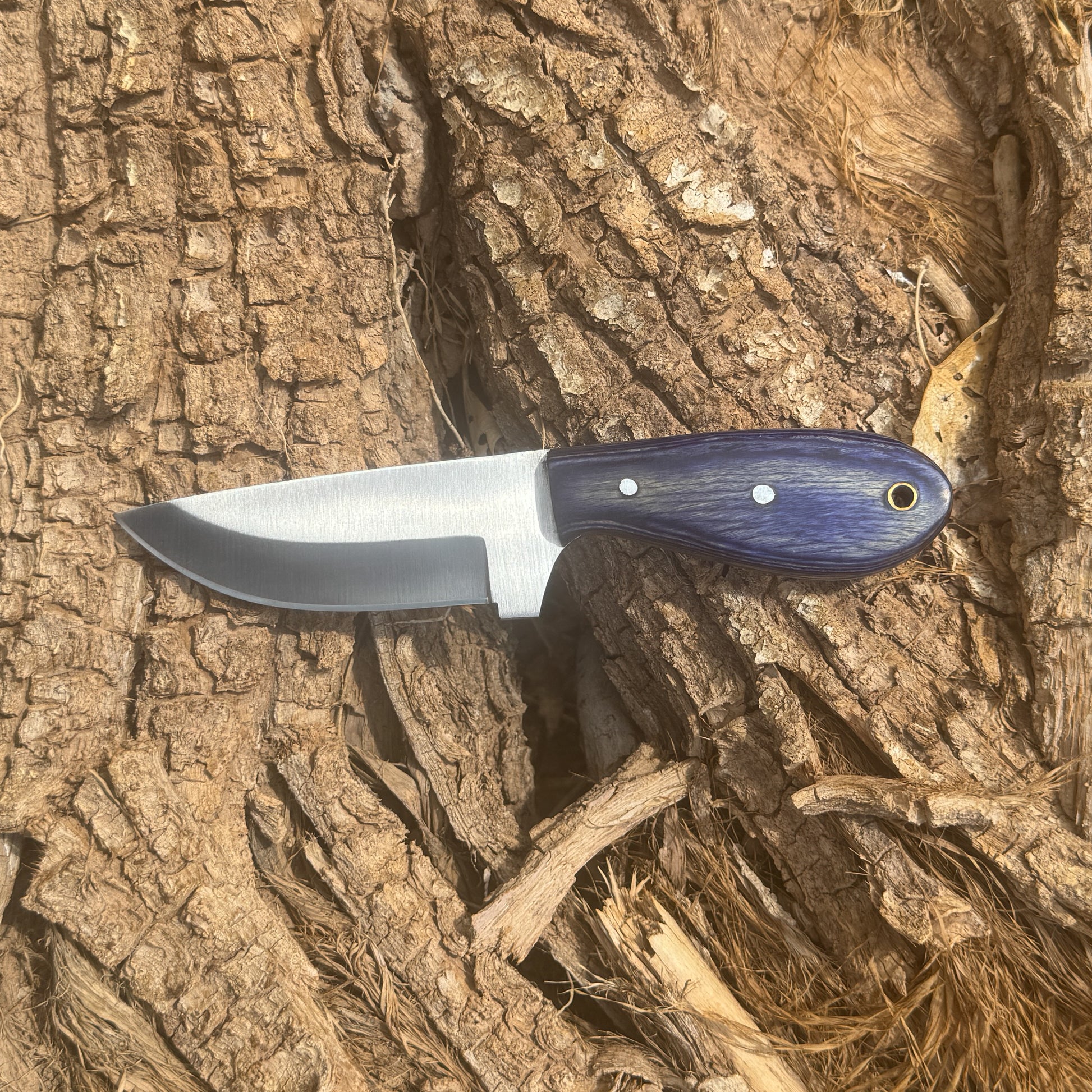 A handcrafted hunter knife with a storm-blue hardwood handle and custom leather sheath, rugged, sharp, and built for the outdoors.