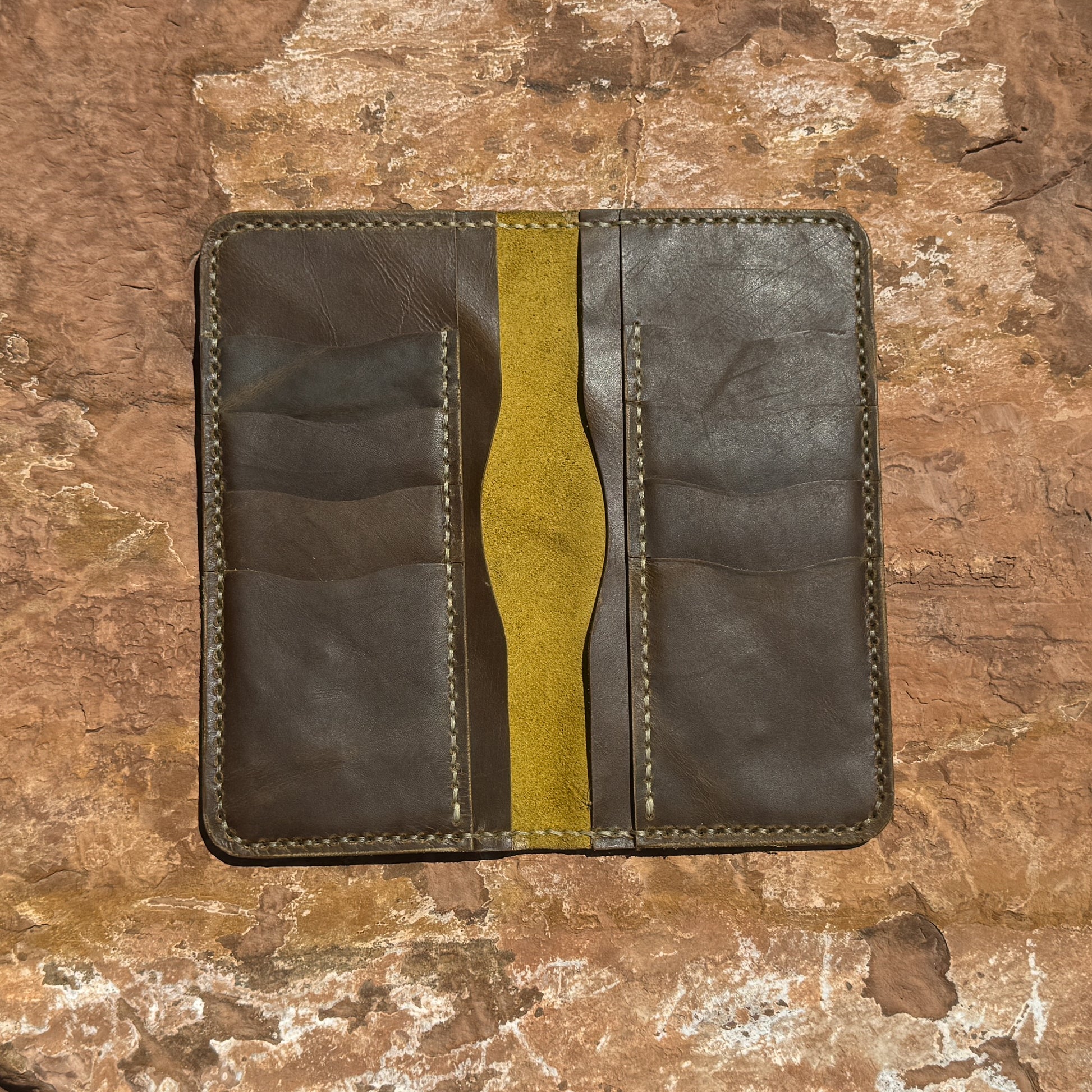 The Ranger pairs rugged durability with refined style, a hand-stitched olive leather bifold with a mustard suede interior, built for everyday reliability and timeless appeal.