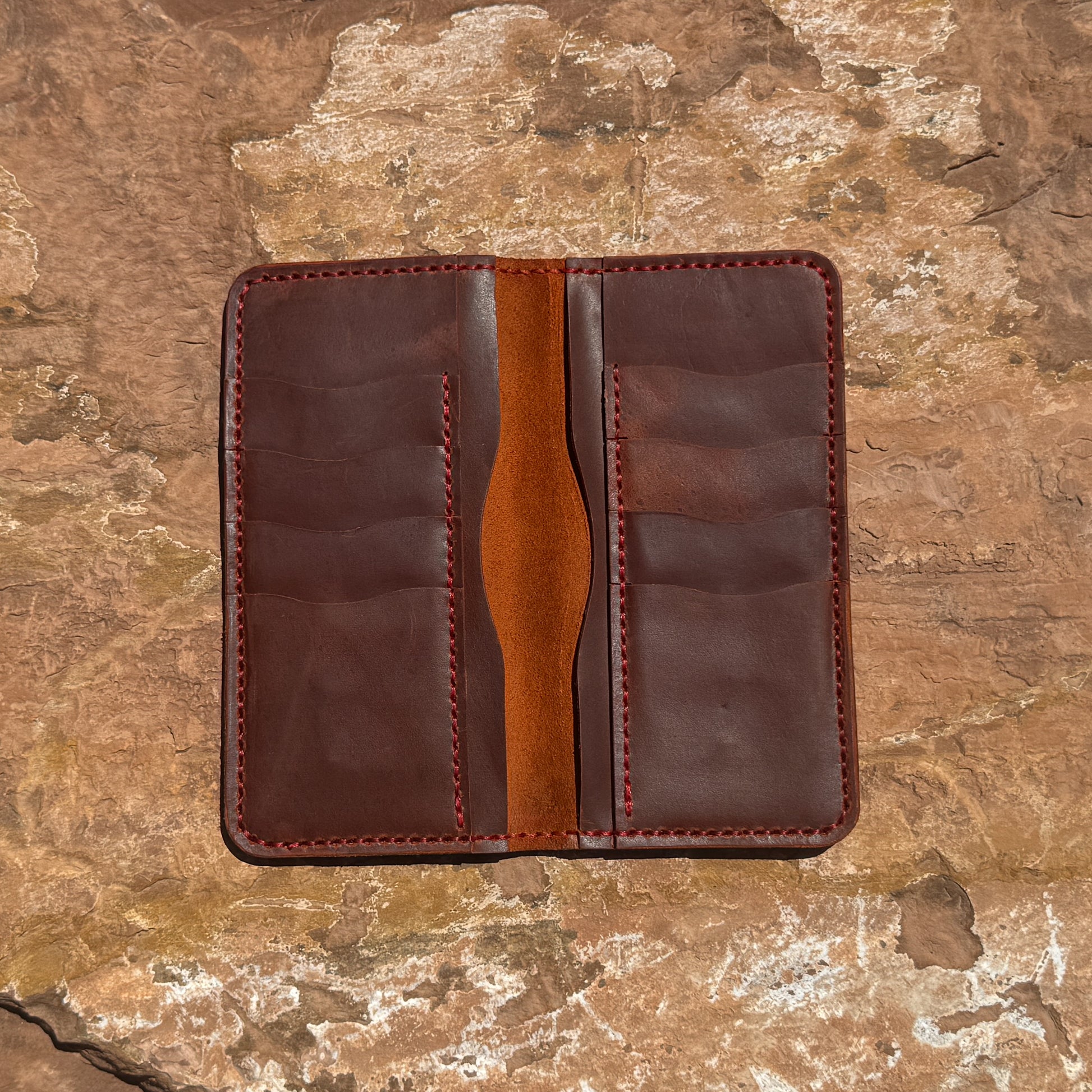 The Trailblazer wallet combines expert craftsmanship with distinctive style. Made from hand-stitched full-grain leather in a rich crimson hue, it features precise red accent stitching that adds a refined, individual touch. Inside, multiple card slots and a roomy cash compartment provide practical organization without sacrificing elegance. Designed for those who lead with confidence, this bifold wallet balances rugged durability with sophisticated functionality.