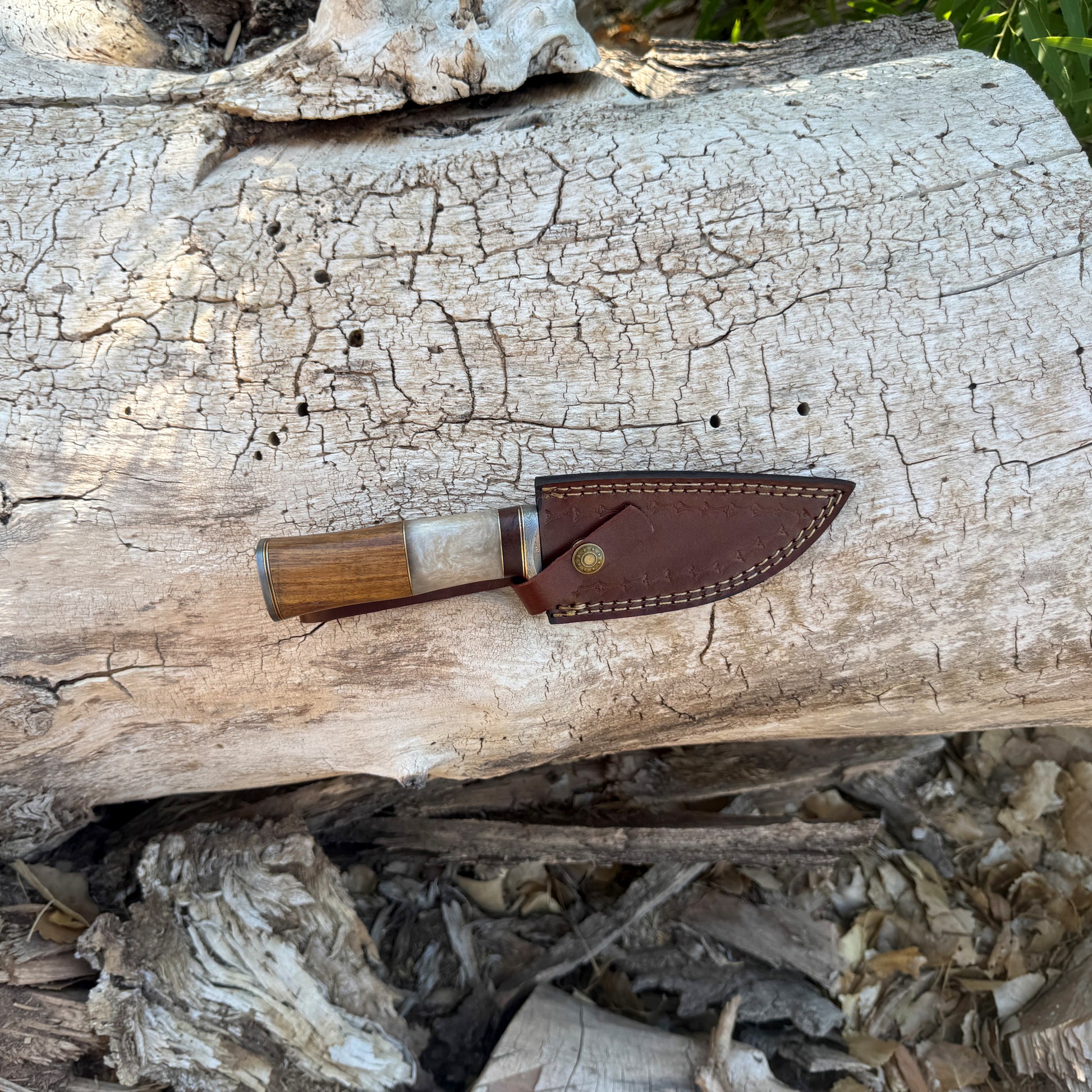 The Timber Ghost is a compact skinner that blends rugged craftsmanship with timeless materials. Its hand-forged raindrop-pattern Damascus blade delivers excellent cutting performance, making it ideal for field dressing, camp tasks, or everyday utility work.