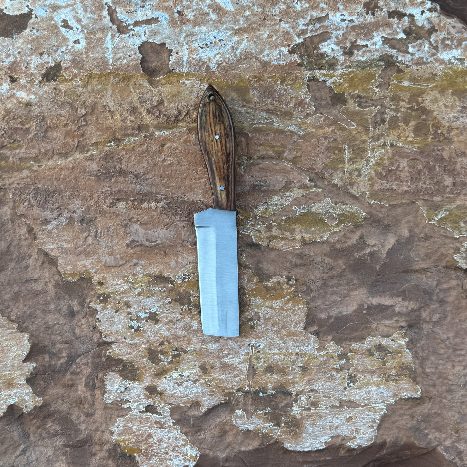 The Wilderness Cowboy Chopper from Blue Spade Forge is built for serious cutting power and dependable performance in the field, at camp, or in the kitchen. Its full-tang, cleaver-style blade delivers exceptional chopping power and clean slicing, making it perfect for food prep, wood processing, and rugged outdoor tasks. Finished with a clean satin polish, the blade offers both durability and a professional, refined appearance.